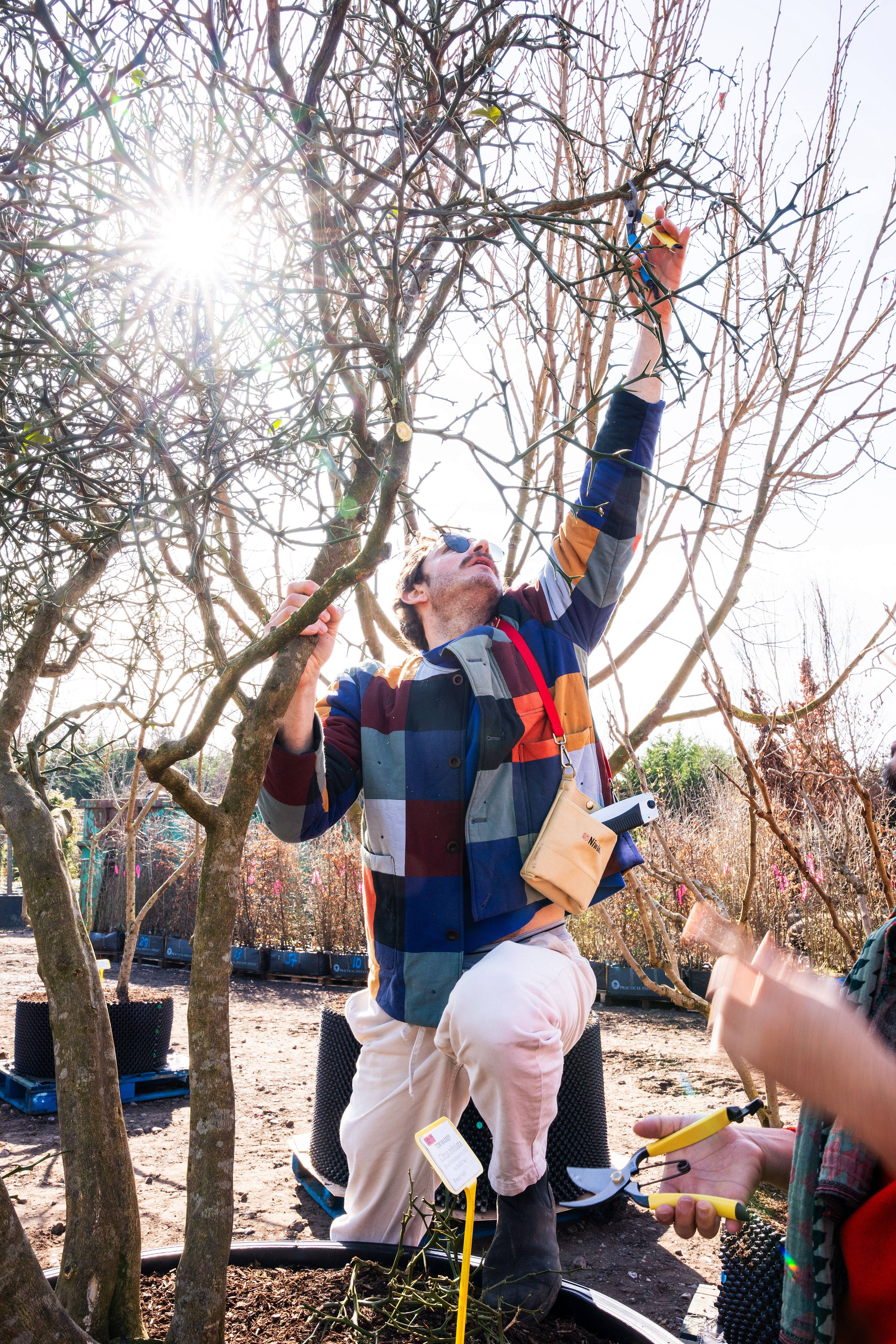 Of course, bare branches make it’s easier to see the structure of the trees, which in turn informs what and how to prune. Transportation and winter weather have both taken their toll on a few of these specimens, so broken branches need to be removed, as do any branches that confuse the ideal shape of the tree. In some cases, a little delicate crown-lifting is required and Tom and Je both take it in turns to shape and trim. Pruning now gives the trees plenty of time to seal and heal before the big days in May, but inevitably there will be some last minute pruning on site to make sure every last detail is just right.