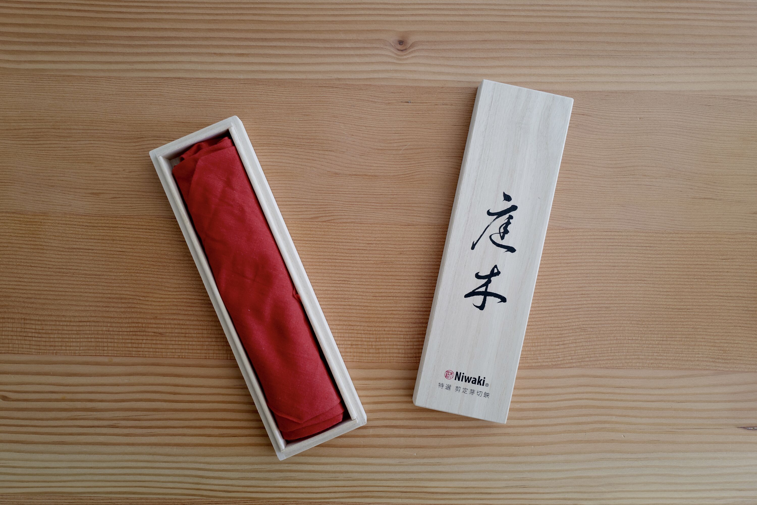 Wrapped in hand-dyed, rugosa-red tenugui cloth, within a Paulownia box. Also available as one third of the Tokusen Set.