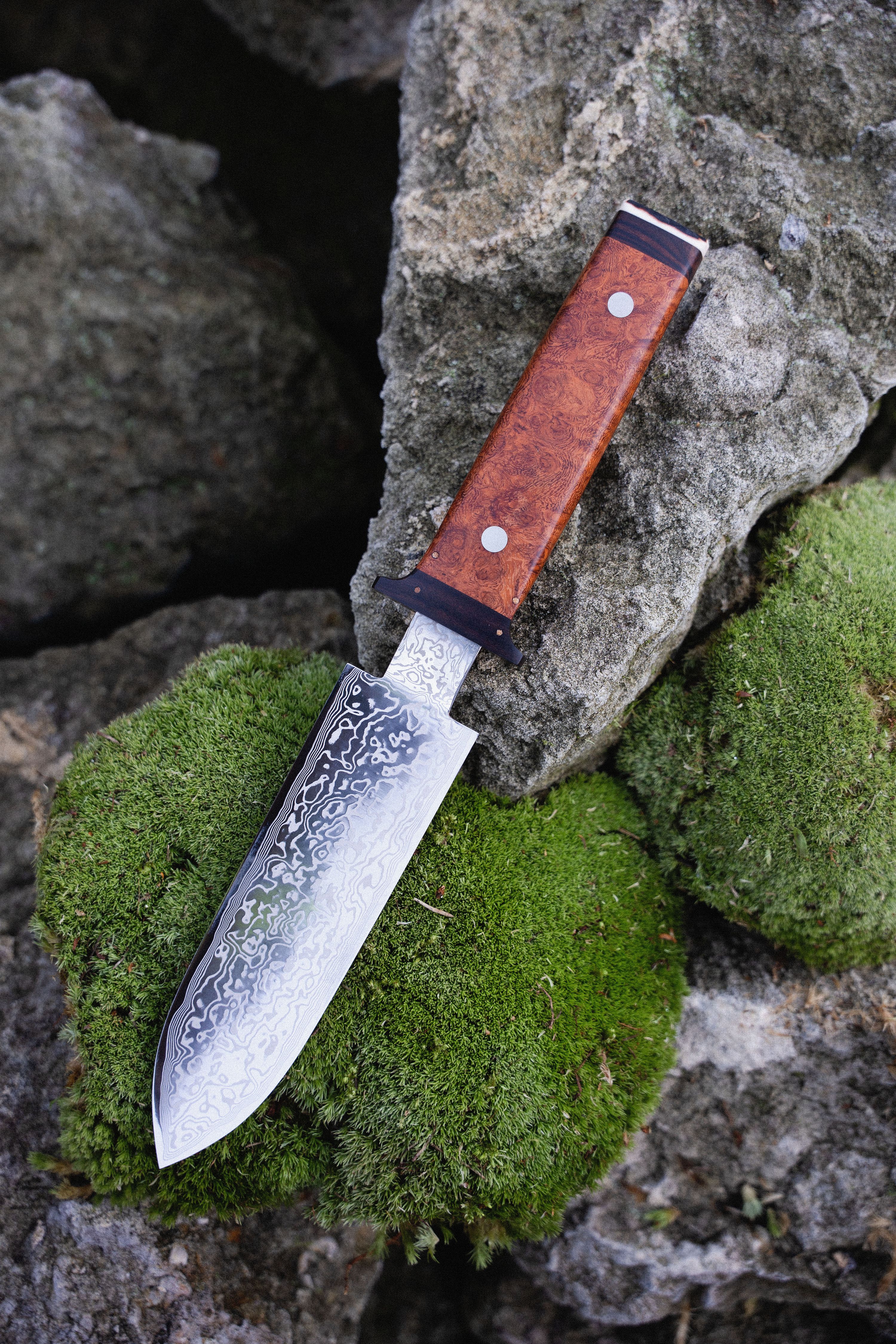 And here they are. Hand forged damascus clad SLD blades with Quince burl handles (that’s Pseudocydonia sinensis to you and me) and ironwood hilts, sheathed in heavy duty, hand-stitched holsters (hand stitched by none other than Mr Kotoh, our friendly pocket knife maker, who often finds himself roped in for special projects such as this.) Truly, truly delightful.