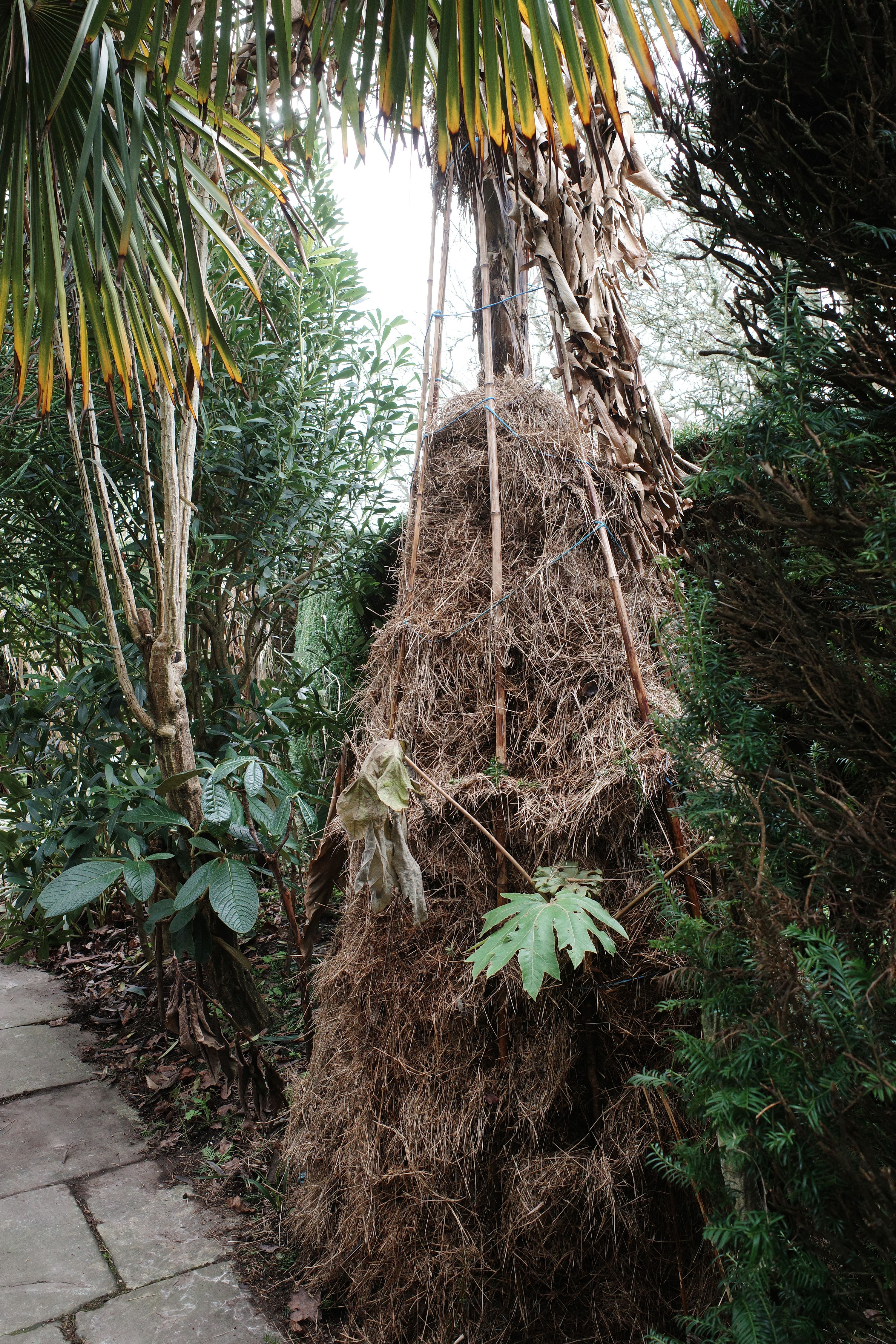 Closer to home, bamboo stakes wrapped with twine and stuffed with straw are used to protect banana plants from cold and wind in some British gardens, including Great Dixter in East Sussex. This helps to prevent rot and protect the tall, trunk-like part of the plant, which is more vulnerable to frost, and adding winter interest to boot.